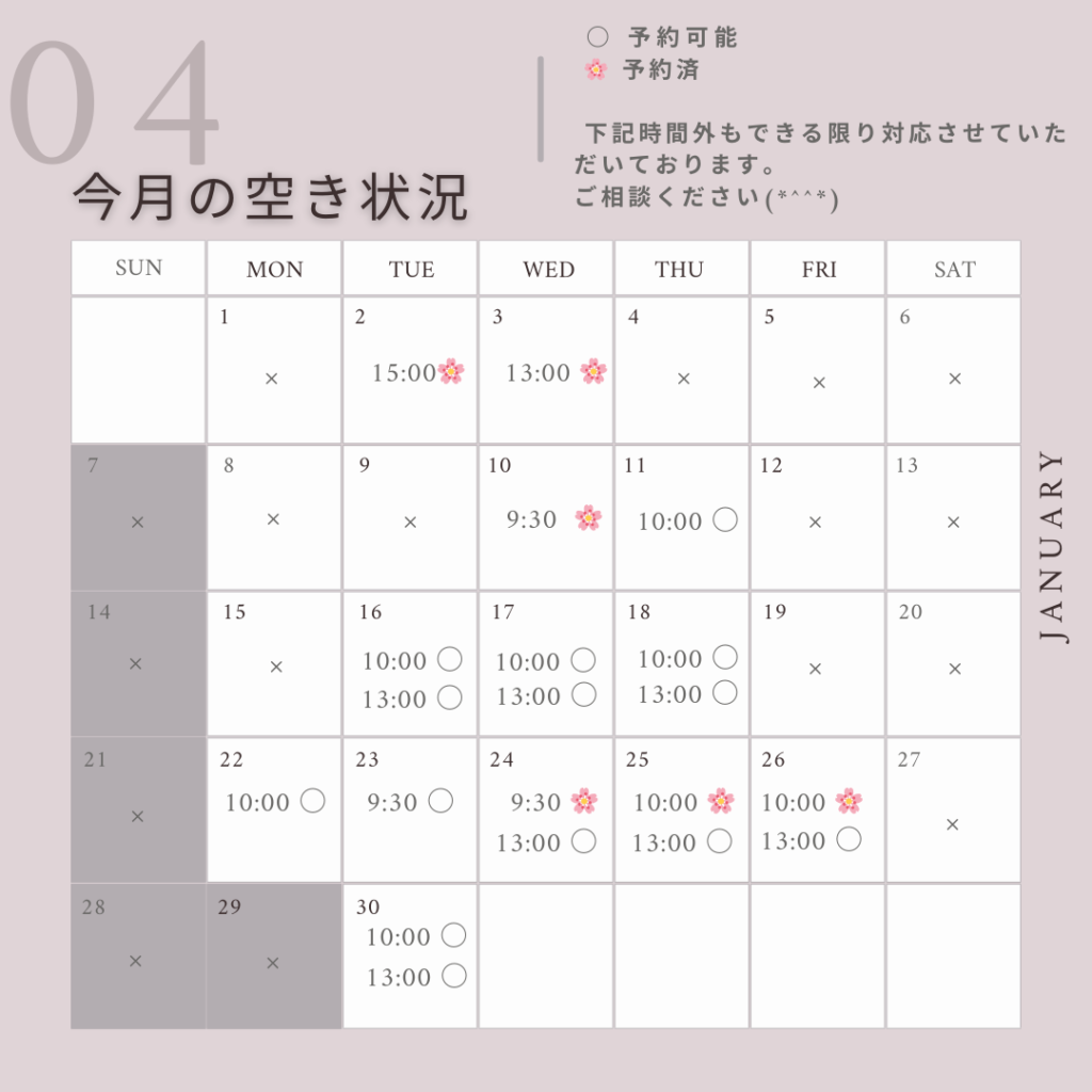 4/1から4/15までのスケジュールは現段階で×にしておりますが、 3/29にまた改めて更新させていただきます。 日にちがあわない方は、公式LINE、InstagramDM、お問合せからご連絡くださいませ。 4月もどうぞよろしくお願いいたします🍃 Ho Leaf...